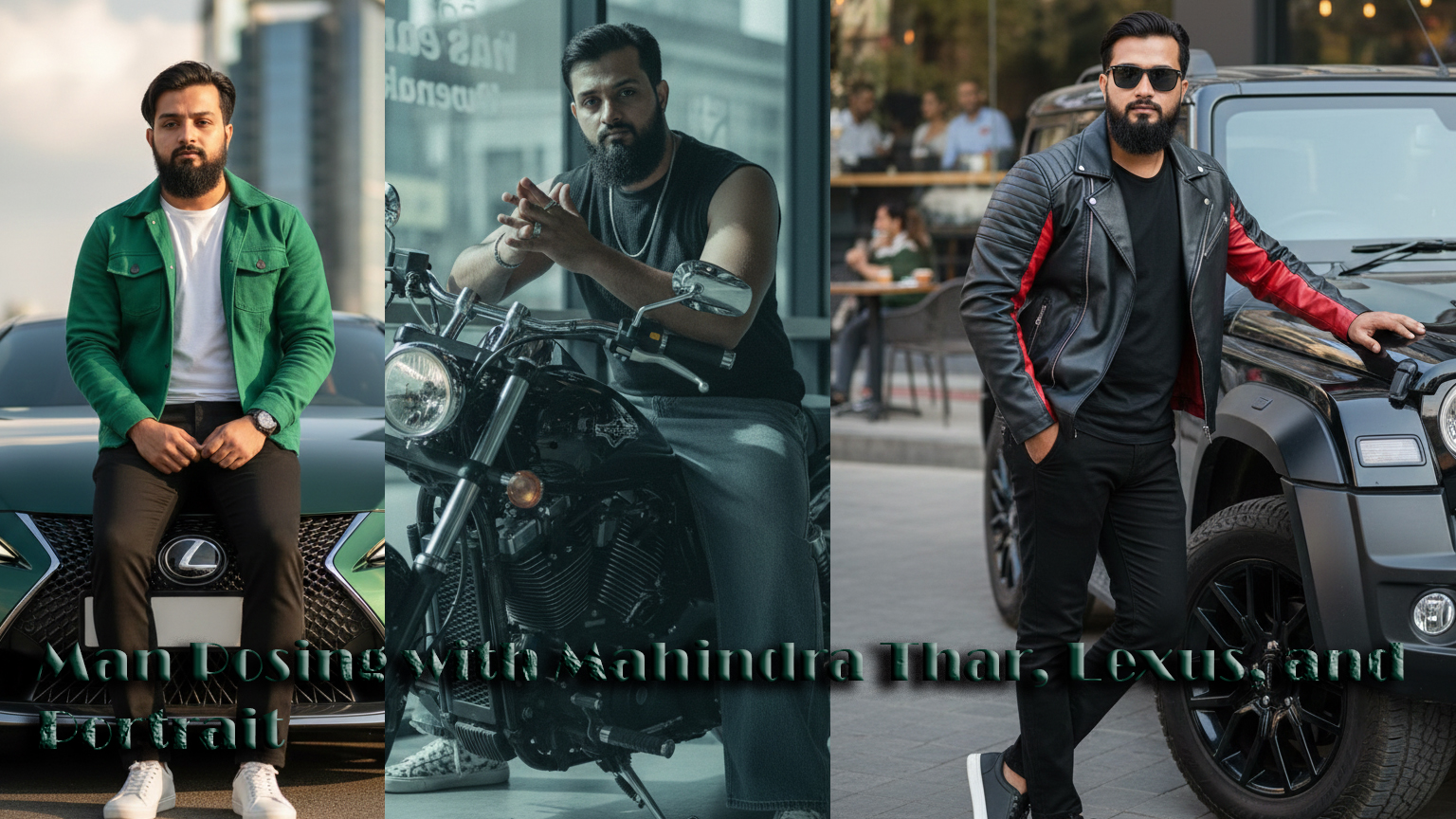 Man Posing with Mahindra Thar, Lexus, and Portrait