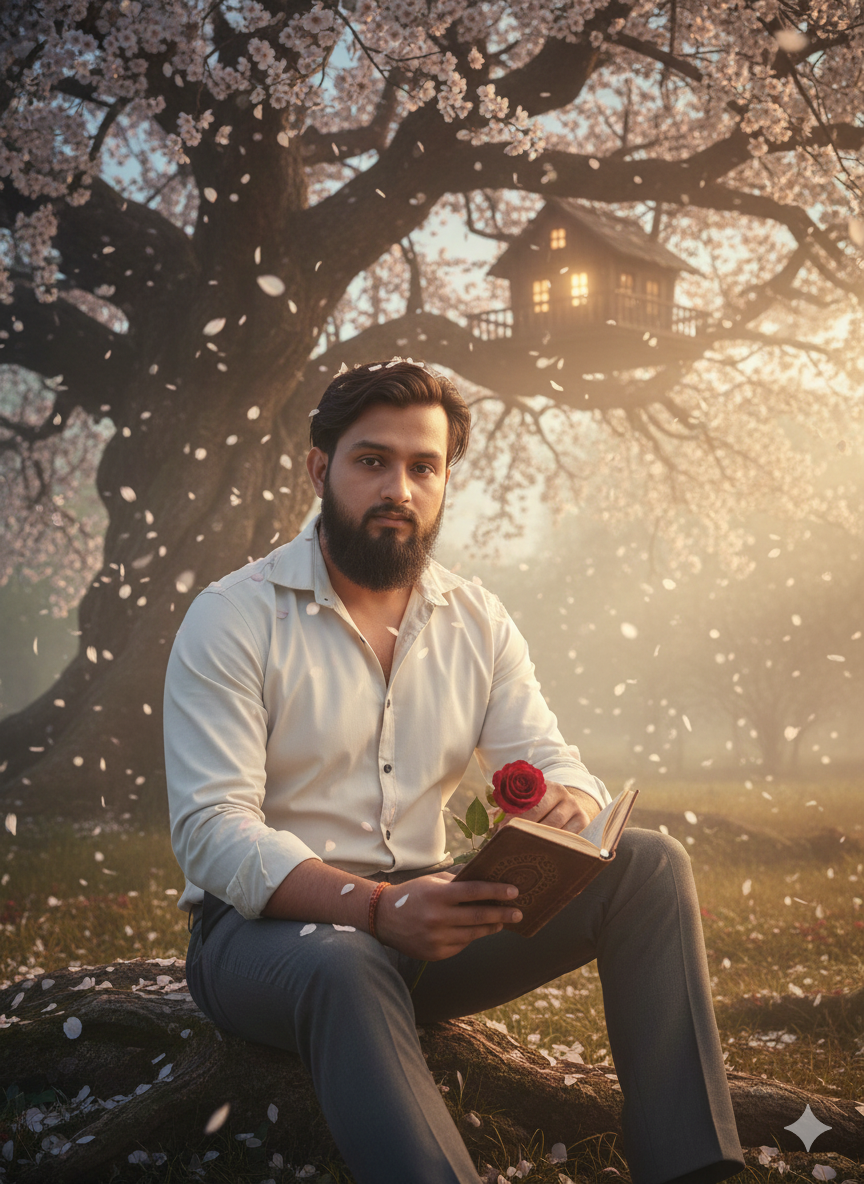 A filmic depiction of the archetypal man positioned under a timeless flowering tree, encircled by drifting petals and gentle morning haze. He grasps a compact leather notebook and a half-bloomed rose, representing unvoiced emotions. A bright treehouse can be seen in the distance, contributing an element of fantasy. His light shirt, tailored pants, and somewhat tousled hair convey a sense of authentic, heartfelt grace. The ambiance stays warm and lifelike.