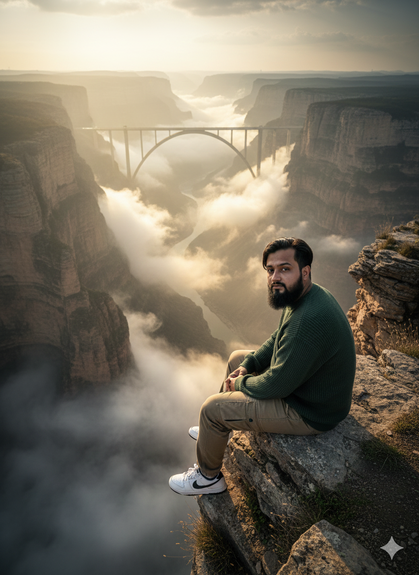 Generate a hyper-realistic 8K aerial image of a man (maintain 100% identical facial characteristics from the reference photo) dressed in an oversized dark green sweater, khaki cargo trousers, and white Nike Dunk shoes. He is perched on the brink of a striking cliff in Huajiang, China, facing toward the stunning Huajiang Grand Canyon Bridge and the expansive valley, with his head turned back to look at the drone camera. Envelop him in a fantastical, dreamlike ambiance – enormous, rolling clouds lazily floating through the canyon below, gentle golden rays of sunlight breaking through the clouds, creating a magical illumination over the bridge and cliffs.