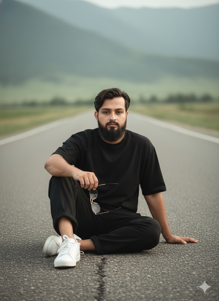 A high-definition, ultra-realistic image features an attractive young male seated assertively on an empty asphalt street. He has dark, wavy hair and a light beard, with flawless facial details retained. Dressed in a minimalistic all-black ensemble — a loose-fitting black t-shirt and black pants, which stand out against striking white sneakers. One hand holds a pair of sunglasses while the other is placed on the surface beneath him. The backdrop reveals misty green hills and mountains, exuding a dramatic high-fashion vibe in gently diffused daylight.