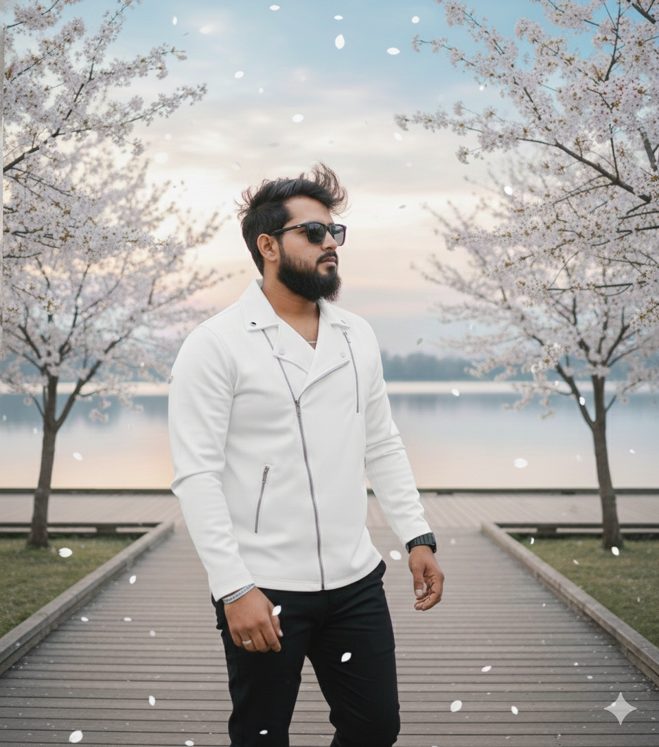 A three-quarters portrait shows a young man walking by a lakeside walkway during the evening, his attire reflecting the dimming blue hues of the sunset, dressed entirely in black. He walks along the tranquil lake that reflects gentle pastel shades behind him. White cherry blossoms float nearby as he stops, surrounded by numerous white-flowering trees, and looks thoughtfully into the distance. A soft mist envelops the scene, adding a layer of emotional richness. The depiction needs to appear truly lifelike. Keep the same face, upload an image.