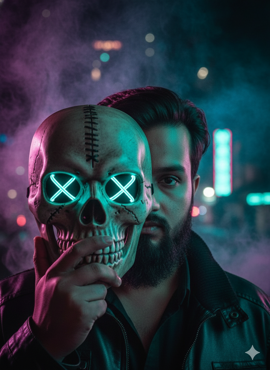“An ultra-realistic film-style close-up featuring a young man with a beard, presenting a sewn skull mask (with stitching on the forehead and mouth, and glowing X’s in the eye sockets) to one side of his face. The scene is illuminated with teal and magenta rim lights, surrounded by thick colored smoke and a blurred urban night backdrop. He has a serious look, wears a dark jacket, and the focus is shallow, resulting in a high-definition, atmospheric neon vibe. ”