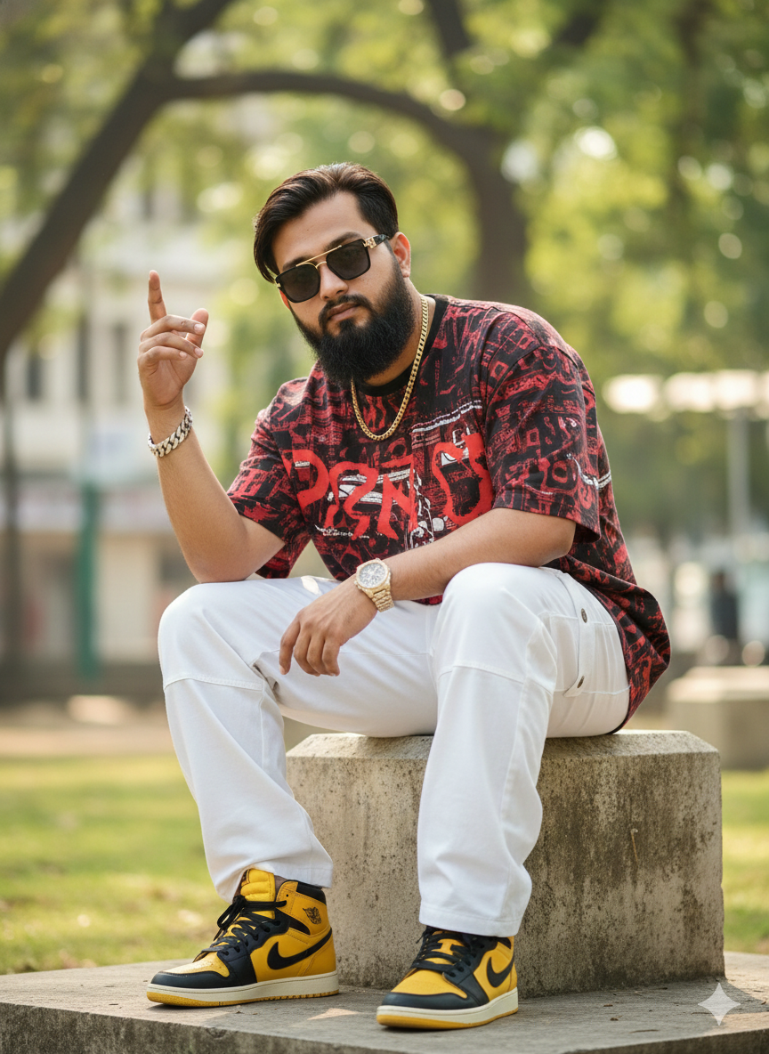 A 21-year-old male is leisurely seated on a spacious concrete platform outside, confidently striking a pose with one arm lifted and the other comfortably placed on his lap, slightly tilted to the side. He is dressed in an oversized graphic tee featuring red and black, baggy white cargo trousers, yellow and black high-top trainers, a silver bracelet, a gold chain, a diamond-studded watch, and black sunglasses with gold detailing. The man luxuriously exudes confidence and comfort. (Face, hairstyle, and beard are identical to the image provided. )