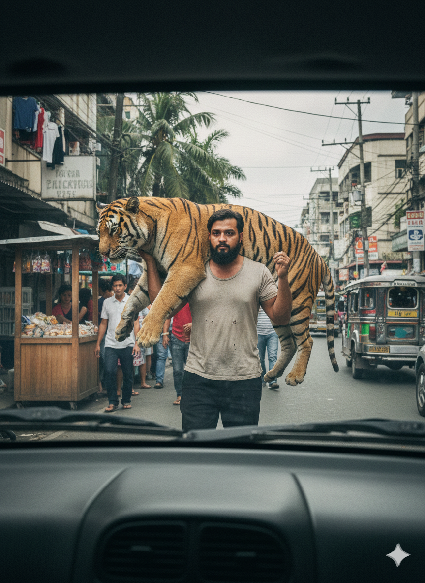 A lifelike urban photography depiction shows an individual from the reference image, lifting a sizable Tiger on his back as though he were peddling it along a bustling city road. The image is captured from within a vehicle, displaying part of the car’s window and dashboard in the foreground, slightly out of focus to enhance dimension. The illumination comes from natural daylight, providing an unfiltered and genuine essence. The individual appears robust and resolute, striding down the street with the considerable Tiger perched on his shoulders. The setting features familiar urban elements such as pedestrians, quaint stalls, and street signage in the Philippines. The general atmosphere is gritty, cinematic, authentic, and documentary-like, as if it were taken unexpectedly while the vehicle is in motion.