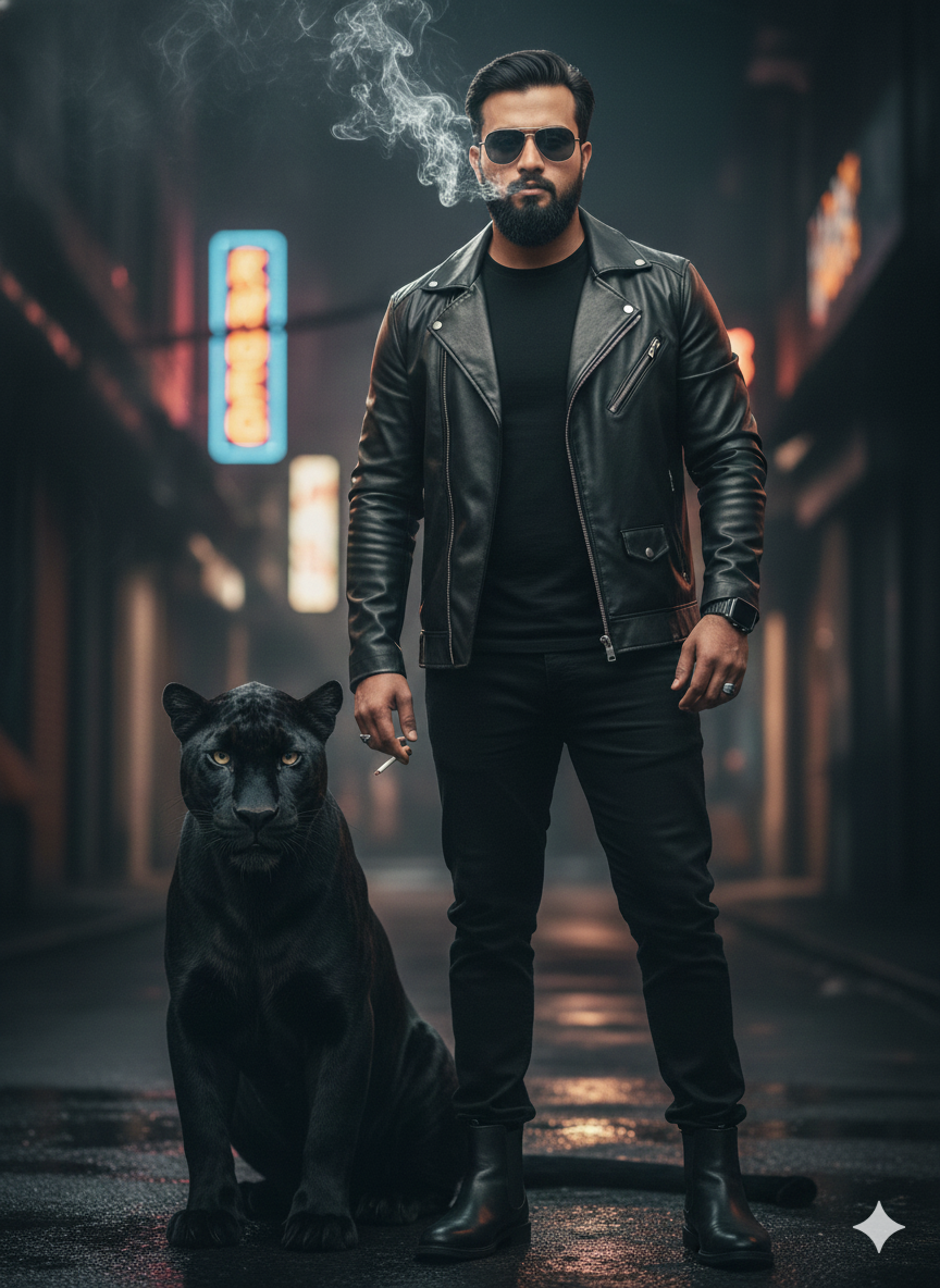 Extremely lifelike full body image of the same individual from the reference picture, with his facial features unchanged from the face swap. He is dressed in a black t-shirt, jacket, and pants. Next to him sits a black panther, while he smokes. He wears metallic black sunglasses and black Chelsea boots, alongside a fashionable watch on his left wrist and an elegant ring. He stands with confidence.