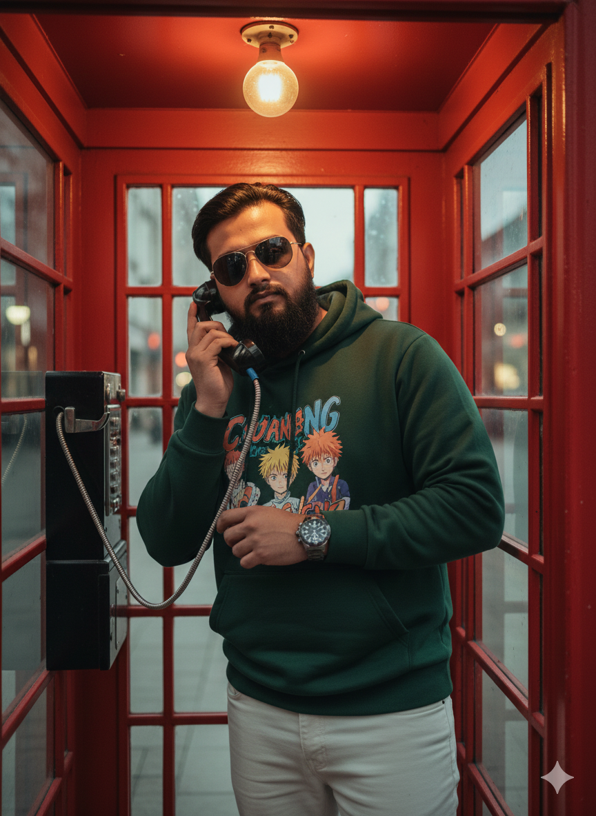 Hyper-realistic 9:16 cinematic image, face aligned with reference. Positioned inside a traditional red British telephone booth, confidently grasping a black receiver.Booth illuminated by a warm overhead light; softly blurred cityscape in the background. The scene exudes a cinematic, retro-modern atmosphere with clear textures, realistic skin, ultra-fine details, 8K ultra HD quality, and balanced illumination with gentle shadows and warm highlights. Wearing a green sweatshirt adorned with anime graphics, light-colored jeans, dark sunglasses, and a timepiece.