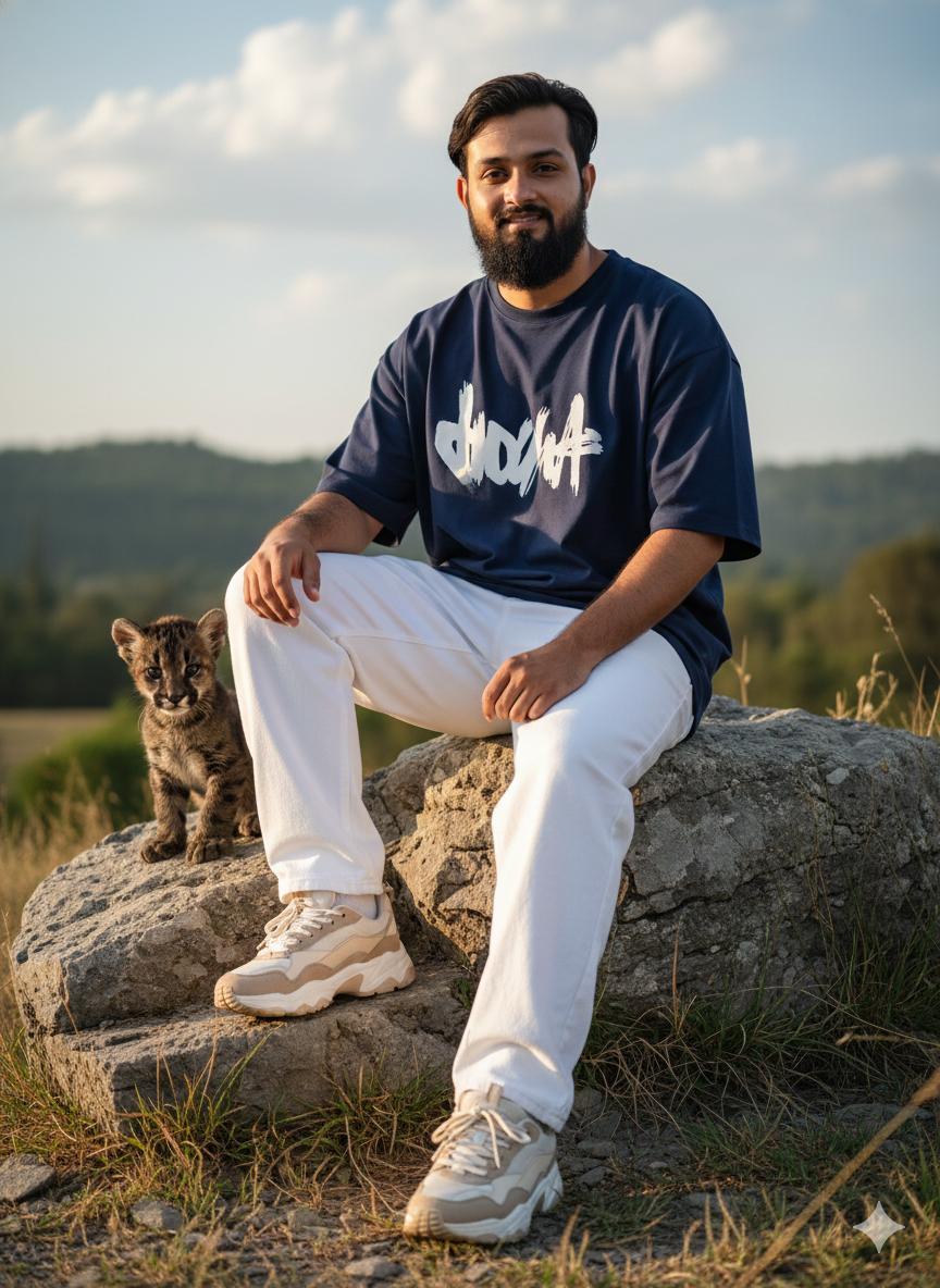 Extremely lifelike full-body streetwear fashion image of a young male perched on a rough stone in an open area, his face perfectly matching the source image. Attire: an oversized navy blue tee adorned with a white design, relaxed fitting white jeans that drape naturally, and thick beige and white sneakers showcasing intricate sole details. A small dark puma sits next to him, featuring a relaxed and cheerful expression.