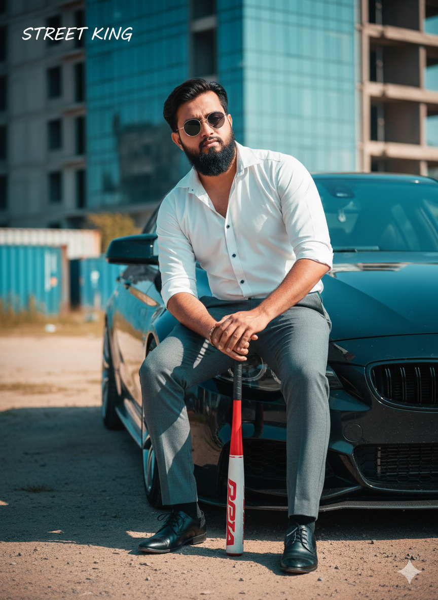 He sports a spotless white formal shirt with the top two buttons undone, sleeves neatly rolled up to his forearms, tucked neatly into tailored gray formal pants. His shiny black formal lace shoes glimmer under the sunlight. The way he is positioned conveys strength, style, and quiet control, resembling a leader overseeing the street.