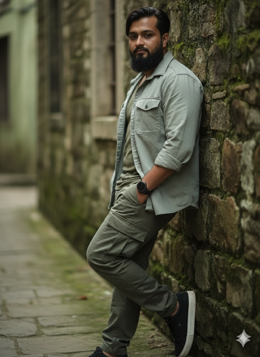 His footwear consists of dark casual sneakers featuring white soles. His outfit comprises an olive green tank top, complemented by a light grey green cargo jacket that has its sleeves rolled up. For the lower section, he wears olive green cargo trousers that have noticeable side pockets.  The scene is illuminated with gentle cinematic lighting, realistic shadows, and sharp textures. . . do not alter the facial appearance of the uploaded image.
