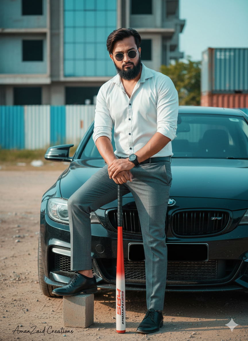A self-assured young boy exuding strong charisma is perched on the edge of the angled front tire of a sleek modified black sedan on a dusty, exposed terrain. He leans slightly forward, with his elbows draped comfortably over his knees, adopting a stance of commanding authority. A red-and-white baseball bat is held vertically between his legs, one hand effortlessly grasping the top of the bat with an air of fearless confidence. His head is inclined a bit upward, presenting an assertive gaze through dark round sunglasses, and his lips are pressed together, reflecting a bold attitude, while his hairstyle is voluminous and elevated.