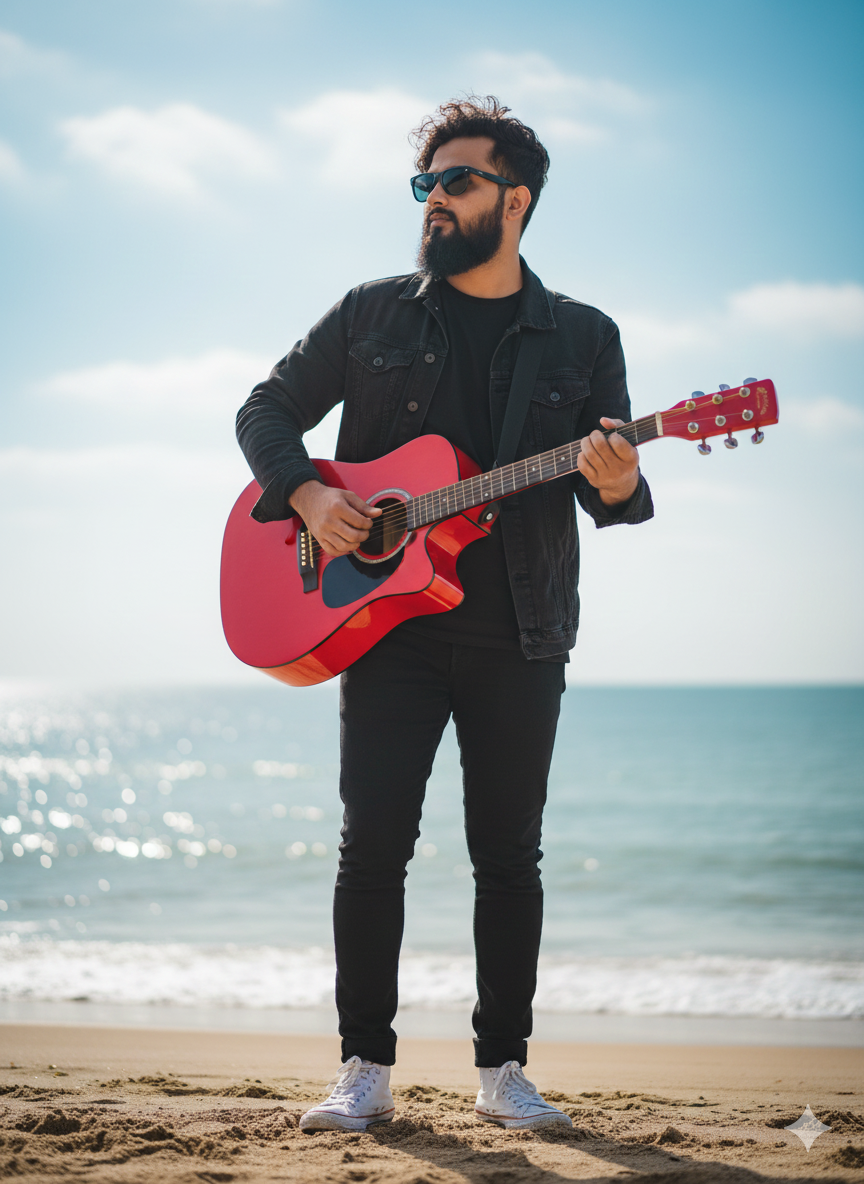 A young man is positioned on a shoreline, strumming a bright red acoustic guitar while gazing slightly toward the sea. He is dressed in a patterned black jacket, a black t-shirt, black trousers, and white high-top sneakers. His hair is naturally curly, and he sports fashionable black sunglasses as a light ocean breeze gently moves his hair. The backdrop features the ocean and a vivid blue sky, with sunlight softly glimmering. His skin reflects natural textures, accompanied by delicate shadows, and the realistic sand is apparent beneath his feet. The image captures dynamic depth of field, enhanced cinematic coloring, volumetric lighting, and is shot from a low angle, showcasing ultra-clear details in 8K resolution. The textures are hyper-realistic, yielding a high-quality editorial portrait with photo-realistic elements, smooth bokeh, and precise focus on the individual. Ensure that the facial features remain unchanged from the provided image; do not modify or redesign the face.