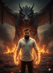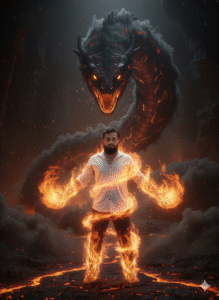 He wears a white shirt glowing in the firelight as deep orange flames spiral from his hands, wrapping around his arms and flowing down to his legs. The cracked volcanic ground beneath him burns with molten light and swirling smoke. Behind him rises the Serpent of Ashes — a colossal black serpent made of smoke and molten veins, golden eyes glowing, and embers drifting from its mouth. Its scales shimmer with dim red heat ,and subtle heat distortion bends the air. The volcanic cavern is dark, lit only by fire and molten reflections, with ash falling slowly through the smoky air. Volumetric lighting reveals depth and motion, creating a dark, hypnotic, and powerful atmosphere.