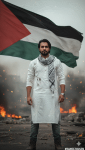100% face no change, create A dramatic cinematic image of a strong young man standing in front of a waving Palestinian flag against a smoky, war-torn background. His facial features and hair remain unaltered as in the reference photo, with a serious, determined expression. He wears a long-sleeved white kurta designed with a flower, and white paint a traditional black and white scarf wrapped around his neck, and rough, #RAMEEZHUSEN