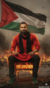 100% face no change, create A dramatic cinematic image of a strong young man in front of a waving Palestinian flag against a smoky, war-torn background. His facial features and hair remain long with ponytail and beard is medium long in size, unaltered as in the reference photo, with a serious, determined expression. He wears a long-sleeved red kurta, black cargo pants, a traditional pure black scarf wrapped around his neck, and rough, and shoes will be sinker color green. The model was sitting in a burning chair #RAMEEZHUSEN