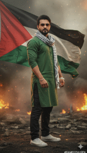 100% face no change, create A dramatic cinematic image of a strong young man standing in front of a waving Palestinian flag against a smoky, war-torn background. His facial features and hair remain unaltered as in the reference photo, with a serious, determined expression. He wears a long-sleeved green kurta, black cargo pants, a traditional green scarf wrapped around his neck, and rough, and shoes will be sinker color white #RAMEEZHUSEN