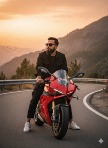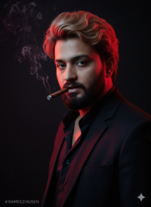 Cigar smoke 🚬🚬🚬Create an image of the person according to the attachment to be with light brown hair, loose fluffy hairstyle, dressed in a black shirt and a dark suit, slightly open the collar, pose at the side corner, smoking on the lips, cigarette smoke floats out thinly, the atmosphere has red and blue lights shining in front of you, creating a dramatic and mysterious tone, studio fashion style, sharp, high detail. use same face from upload image