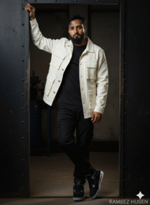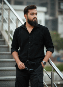 Ultra- realistic half-body cinematic portrait of an 34 -year-old South Asian slim man with exact face from reference, wearing a deep and black corduroy shirt with rolled-up sleeves, black cargo pants, and a circle, and a Fire Boult silver smart watch, Leaning on photo silver staircase railing, left hand in pocket, right ngled, looking the right side, right hand holding sunglasses. Background: realistic, heavy, Blurred outdoor staircase with silver. same as my uploaded face..