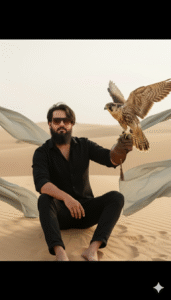 A cinematic, full-body portrait of a handsome, rugged man with a dark beard and sunglasses, standing on a large golden-sand desert dune. He is wearing a textured black shirt and black jeans. and sitting without shoes, a large Peregrine Falcon is perched on its gloved left hand with its wings dramatically spread wide. Several large, flowing sheets of light sage green silk fabric are dynamically billowing around the man and the falcon. High detail, natural lighting, cinematic photography, soft shadows, epic atmosphere, use the same face upload image and beard medium long size, and the image should be a little closer to the camera