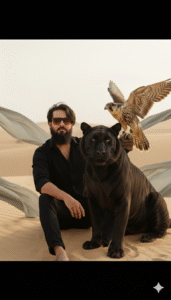 A cinematic, full-body portrait of a handsome, rugged man with a dark beard and sunglasses, standing on a large golden-sand desert dune. He is wearing a textured black shirt and black jeans. and sitting without shoes large Peregrine Falcon is perched on its gloved left hand with its wings dramatically spread wide. Several large, flowing sheets of light sage green silk fabric are dynamically billowing around the man and the falcon. High detail, natural lighting, cinematic photography, soft shadows, epic atmosphere, use the same face upload image and beard medium long size, and the image should be a little closer to the camera aadd balck tiger with closer