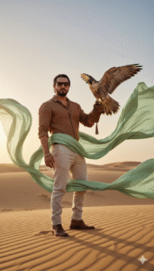 A cinematic, full-body portrait of a handsome, rugged man with a dark beard and sunglasses, standing on a large golden-sand desert dune. He is wearing a textured white design shirt and black jeans. A large Peregrine Falcon is perched on its gloved left hand with its wings dramatically spread wide. Several large, flowing sheets of light sage green silk fabric are dynamically billowing around the man and the falcon. High detail, natural lighting, cinematic photography, soft shadows, epic atmosphere, use the same face upload image and beard medium long size, and the image should be a little closer to the camera