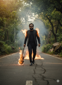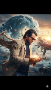 “Ultra-realistic cinematic Dutch-angle (tilted frame) over-the-shoulder shot of the uploaded person (preserve exact face and body identity), wearing a ripped linen suit flaring dramatically in the wind. He is staring down intently at a delicate, glowing flower resting in his hand. Behind him, a massive tsunami wave crashes violently into a collapsing bridge, with cars, debris, and fragments scattering midair in slow motion. Add dynamic motion blur streaks, glowing embers, and cinematic lens flares cutting across the frame. Apply dreamlike atmosphere with heavy film grain, soft bloom, chromatic aberration, and surreal color grading — emphasizing chaos yet wonder. Portrait orientation, ultra-detailed, sharp face, and natural skin texture.” Negative prompts: “No identity change, no extra people, no cartoon or anime effect, no distortion of body or face, no unrealistic props, no neon cyberpunk colors.” Aspect ratio & style params: –ar 2:3 –quality 2 –steps 40-50 –v 5 –style cinematic