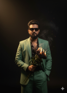 A trendy young man standing against a dark, minimalist background with a warm golden sunshine beam creating dramatic shadows is depicted in this incredibly lifelike cinematic portrait. With one hand casually in his pocket and the other clutching a bouquet of black flaming flowers, ashes, a sock, and a lighted fire near his chest, he is dressed in a dapper, elegant sage green suit and an open-buttoned black silk shirt (blazer and wide-leg pants). Put on black eyeglasses. His hair is organically groomed with texture, voluminous, and somewhat disheveled.