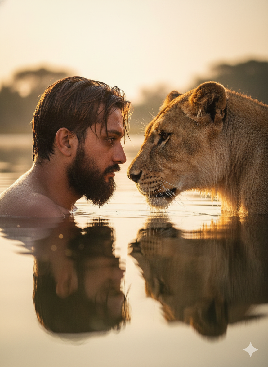 An ultra-realistic, film-like close-up side view of an attractive male [refer to the source image; maintain complete accuracy of facial features] featuring damp, brown locks, next to a regal lioness, with their faces just about touching. Both figures are partly immersed in tranquil, reflective water, resulting in a flawless mirrored image beneath the surface. The illumination is naturally dramatic, typical of the golden hour, highlighting the textures of the moist skin and the lioness’s coat. Strong emotion, sharp focus, high contrast, 8K hyper-realistic quality, shallow depth of field, a true masterpiece.