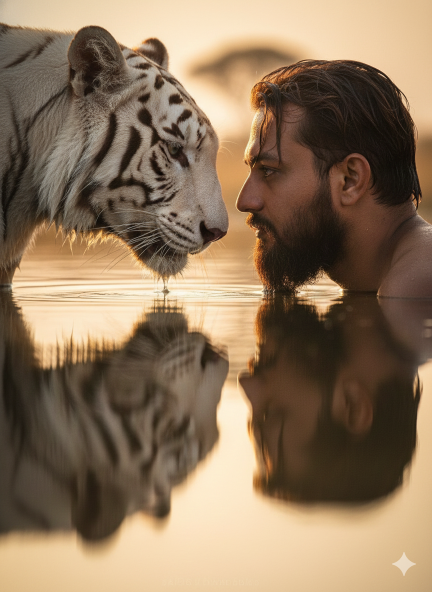 A strikingly lifelike, cinematic close-up side view of an attractive male [refer to the provided image; maintain all facial features with complete accuracy] featuring damp, brown locks, positioned next to a regal White tiger with their faces almost in contact. Both figures are partly immersed in tranquil, reflective water, forming an impeccable mirrored image beneath the water’s surface. The illumination is natural with the dramatic light of the golden hour, highlighting the details of the lioness’s coat. Powerful emotion, profound focus, high contrast, 8K photo-realistic excellence, and a shallow depth of field, a true masterpiece.