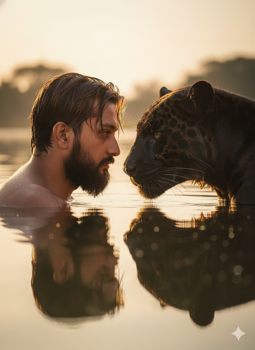 An ultra-realistic, film-like close-up side view of an attractive male figure [refer to the source image; maintain all facial characteristics with complete accuracy] featuring damp, brown locks, next to a grand black jaguar, their faces almost in contact. Both individuals are partly immersed in tranquil, reflective water, producing an impeccable mirrored image beneath the surface. The illumination is natural and striking during the golden hour, highlighting the details of the lioness’s moist skin and the lioness’s coat. Strong emotion, profound focus, high contrast, 8K lifelike imagery, shallow focus, work of art.