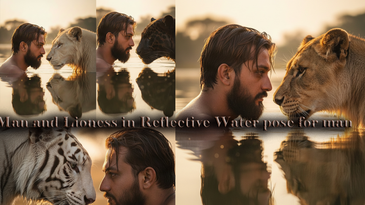 An ultra-realistic, film-like close-up side view of an attractive male [refer to the source image; maintain complete accuracy of facial features] featuring damp, brown locks, next to a regal lioness, with their faces just about touching. Both figures are partly immersed in tranquil, reflective water, resulting in a flawless mirrored image beneath the surface. The illumination is naturally dramatic, typical of the golden hour, highlighting the textures of the moist skin and the lioness’s coat. Strong emotion, sharp focus, high contrast, 8K hyper-realistic quality, shallow depth of field, a true masterpiece.