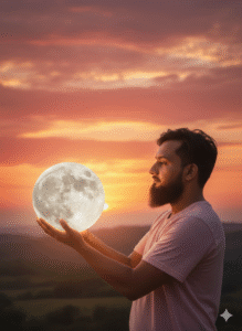 “8K Ultra HD, vertical 9:16 cinematic photorealistic portrait of the same young man (use the exact same face, hairstyle, and skin tone as in the attached photo). He stands outdoors at sunset, waist-up, positioned on the right third of the frame, in profile facing left. He is lifting a giant glowing full moon with both hands — palms supporting its underside, fingers spread naturally. Use same face upload image