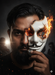 Hyperrealistic portrait of me with an intense expression, luminous skin, in a dark setting with dramatic lighting.I hold a partially burnt white mask in front of my face; the mask is cracked and burning along one edge with bright orange fire. The other half of my face is clearly visible, with wethair and a piercing gaze. Dark background with a flash of floating ash. A mysterious and emotional atmosphere, 4K quality, strong contrast, and a symbolic tone about identity, strength, and transformation #RAMEEZHUSEN.