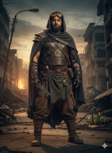A 16k high-resolution, full-body, hyper-realistic, and cinematic DSLR photo of a young, stylish man with sharp, consistent facial features. He is a dystopian survivor/wasteland warrior figure.