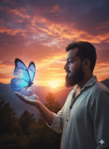 8K Ultra HD, vertical 9:16 cinematic photorealistic portrait of the same young man (use the exact same face, hairstyle, and skin tone as in the attached photo). He stands outdoors at sunset, waist-up, positioned on the right third of the frame, in profile facing left. He is lifting a giant glowing butterfly and the butterfly is blue with one hand — palms supporting its underside, fingers spread naturally. Use the same face upload image