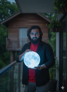 4k ultra HD fantasy portrait of a man holding the glowing, radiant big moon gently in both hands, standing confidently in an urban balcony setting. He wears a brown shirt and gray pants, accompanied by a stylish watch. The background is a 50mm lens camera, softly blurred greenery and a wooden house with blue magical moonlight casting a soft glow on his face, highlighting his lifelike skin texture and sharp facial features. The scene seamlessly blends modern reality with surreal, cosmic elements, creating a captivating effect. Use the same face upload image and change the t-shirt color to red with a black jacket and medium-long hair