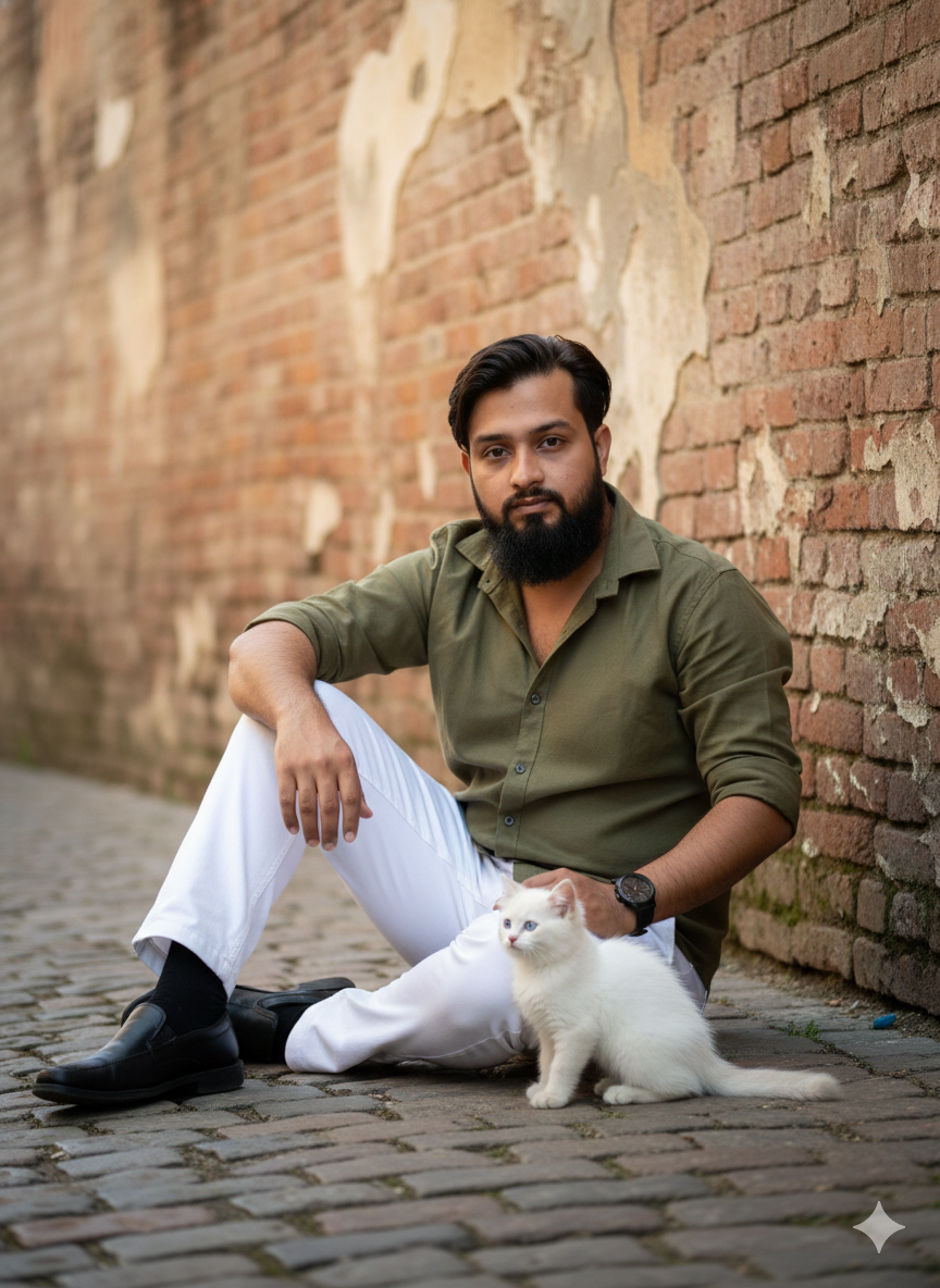 Create this image based on the given description, maintaining facial features to ensure realism. Position me on the ground with my feet planted, while an aged wall arcs behind me. Beside me sits an adorable white cat, gazing at me and holding my hand. I have on white trousers, black footwear, a stylish black timepiece, and an olive-hued shirt, with my facial expression remaining the same. I am looking straight at the camera.