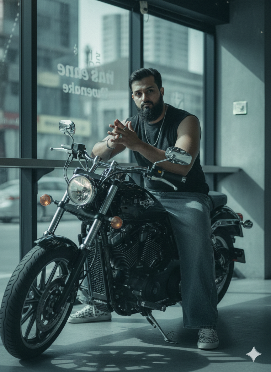 Cinematic complete portrait of a male motorcyclist comfortably positioned on a dark cruiser motorbike, leaning ahead with hands together. Outfit: black sleeveless shirt, baggy denim trousers, sneakers with a white pattern, limited accessories, edgy urban fashion vibe. An urban coffee shop scene can be seen through the transparent window with subtle text; the cityscape is slightly out of focus. Atmospheric teal-gray color tones, rough textures, gentle natural illumination, pronounced shadows, defiant demeanor, taken with 35mm film photography. Do not alter the face; upload the image.