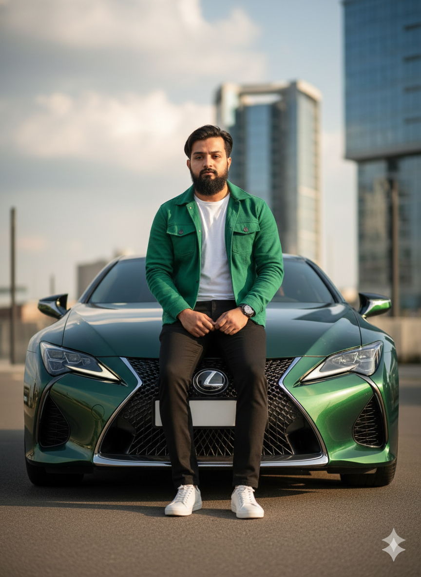 8K ultra-realistic cinematic image of a fashionable young man perched on the front of a dark green Lexus sports vehicle, capturing a contemporary lifestyle moment, featuring the identical facial features as in the reference image (face must remain unchanged), casual hairdo, self-assured look, dressed in a green jacket, a white t-shirt, black trousers, and white sneakers, posing like a fashion model, illuminated by gentle sunlight, intricate details on the attire, reflections from the luxury car, a modern structure behind, affluent. Do not modify the face; upload the picture.