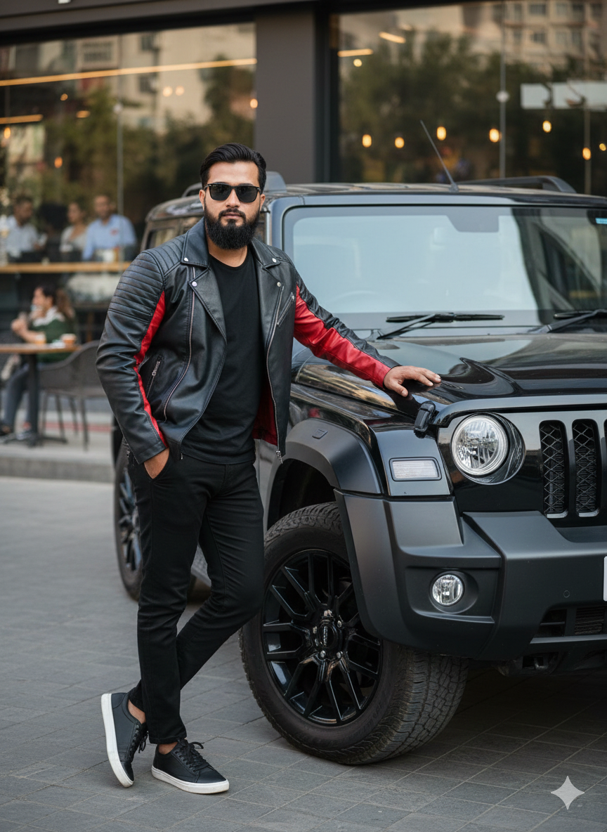 Highly realistic cinematic full-body image of a fashionable young man with precise facial characteristics and coordinated hairstyle from the reference photo, directing gaze at the camera. He is dressed in dark shades, a black and red leather jacket, a black t-shirt, tailored black pants, and stylish sneakers. He is positioned leaning against an upscale black Mahindra Thar SUV, with one shoulder resting on it, one hand in his pocket, and the other on the vehicle’s hood. The Thar features large alloy wheels and a shiny exterior. Surroundings include a contemporary coffee shop, passersby, and natural sunlight; maintain the facial image upload.
