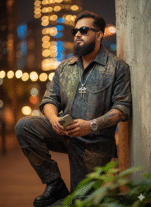I’M WEARING AN OVERSIZED HAND-MADE OUTFIT, BLACK SHOES, SILVER WATCH, AND HAND-MADE. LOOKING THOUGHTFULLY OFF-CAMERA, HOLDING AN IPHONE 17 PRO, LEANING ON A WALL. BLURRED GREEN LEAVES IN FOREGROUND. FLAWLESS GLOWING SKIN, VIBRANT BOKEH CITY LIGHTS BACKGROUND, WARM CINEMATIC MOOD.KEEP MY FACE 100% SAME AS REFERENCE IMAGE. WEAR CHAIN AND TAΤΤΩΩ ΩΝ ARM AND BLACK SUNGLASSES. same face upload image