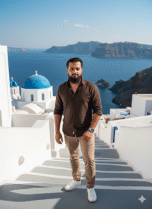 Ultra-realistic, hyper-detailed full-body photoshoot of the same man (use reference face exactly), standing stylishly on white Santorini-style stairs with blue-domed buildings and the Aegean sea in the background. He wears a dark brown shirt with sleeves rolled up, light brown trousers, white sneakers, and a luxury wristwatch. Soft daylight, cinematic lighting, 8K DSLR clarity, perfect face match, realistic skin texture, natural shadows, and vibrant Mediterranean tones.