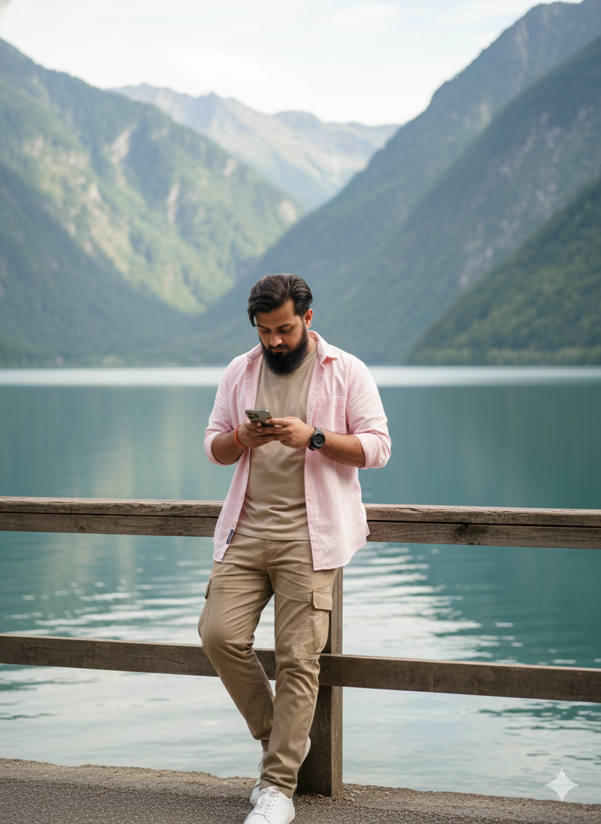 Design a depiction of a young man embodying a travel lifestyle, resting against a weathered wooden railing adjacent to a vast lake. He seems to be focusing on and engaging with his smartphone. (Reference face) His attire includes a light pink button-up shirt worn over a beige crew neck t-shirt, paired with khaki cargo trousers and white athletic shoes. The backdrop showcases a breathtaking scene with serene waters and imposing, vibrant green mountains.