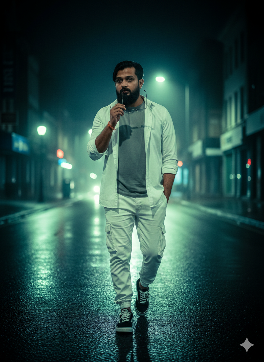 Produce a stylized cinematic night image featuring a young man strolling along a deserted, damp street with a cheerful expression. He is clad in a crisp white shirt unbuttoned over a grey t-shirt, white cargo jogger pants, and black-and-white sneakers. In one hand, he is grasping his glasses near his lips, gazing to the side. The setting is bathed in bright, cool green and white light from far-off street lamps, creating a vivid and dramatic hyperrealistic atmosphere. (reference face uploaded image)
