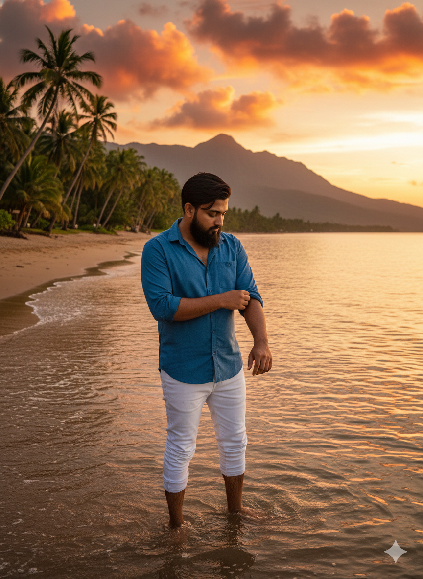 Create (without altering the reference face image) an impressive beach portrait at sunset of a young man, dressed in a blue shirt (open at the neck) and white jeans, positioned at the shoreline and fiddling with the sleeve cuff. The backdrop showcases gentle ocean waves, palm trees, and coconut trees, along with a golden and orange sky filled with clouds during sunset, and a prominent dark mountain outline across the water. The atmosphere is peaceful and contemplative.