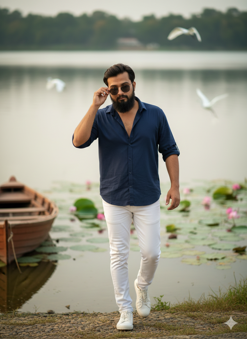 Create a fashionable young man, (referring to the uploaded face image) dressed in a relaxed navy blue shirt with one sleeve rolled up and unbuttoned, along with white jeans and white sneakers, strolling beside a tranquil lake, complete with a boat, lotus flowers, and birds. He is casually holding his sunglasses down a bit, exuding a cool vibe. The setting features soft natural light, capturing a refined outdoor portrait.