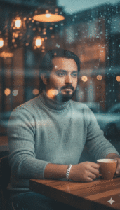 Cinematic portrait. A man sitting at a rainy cafe window, wearing gray turtleneck. Rain droplets on glass create bokeh effects with city lights. The film looks with a shallow depth of field. Cool blue tones outside contrast with cozy cafe lighting inside this moody urban tale.Vintage film grain and desaturated colors. Contemplative expression as the subject gazes through the window. Professional framing emphasizing reflection and separation between interior warmth and exterior city movement. Use the same face upload image