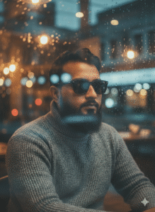 portrait in film. A man in a gray turtleneck sits by the cafe window in the rain. City lights and raindrops on glass provide bokeh effects. shallow depth of field film look. Inside this gloomy urban narrative, comfortable cafe lighting contrasts with cool blue tones outside.Desaturated hues and roughness from an old film. expression of contemplation as the individual looks out the window. excellent framing that highlights introspection and distinguishes between the movement of the city outside and the coziness of the home. Put black googals in the same face upload image.