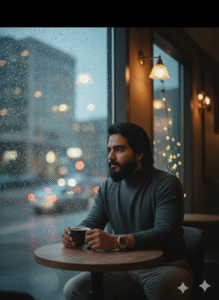 Cinematic portrait. A man sitting at a rainy cafe window, wearing gray turtleneck. Rain droplets on glass create bokeh effects with city lights. The film has a shallow depth of field. Moody urban storytelling with warm cafe lighting inside, contrasting cool blue tones outside. Vintage film grain and desaturated colors. Contemplative expression as the subject gazes through the window. Professional framing emphasizing reflection and separation between interior warmth and exterior city movement. Use the same face upload image.
