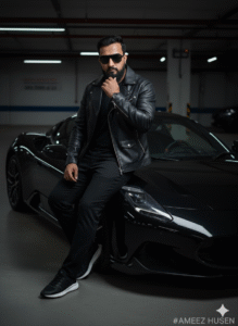 Prompt 1/2 A hyper-realistic, ultra-sharp cinematic portrait of a stylish man leaning casually against a sleek black Maserati MC20 supercar. a thoughtful gesture. He wears a fitted black leather jacket, tailored black pants, and dark sneakers with crisp white soles.