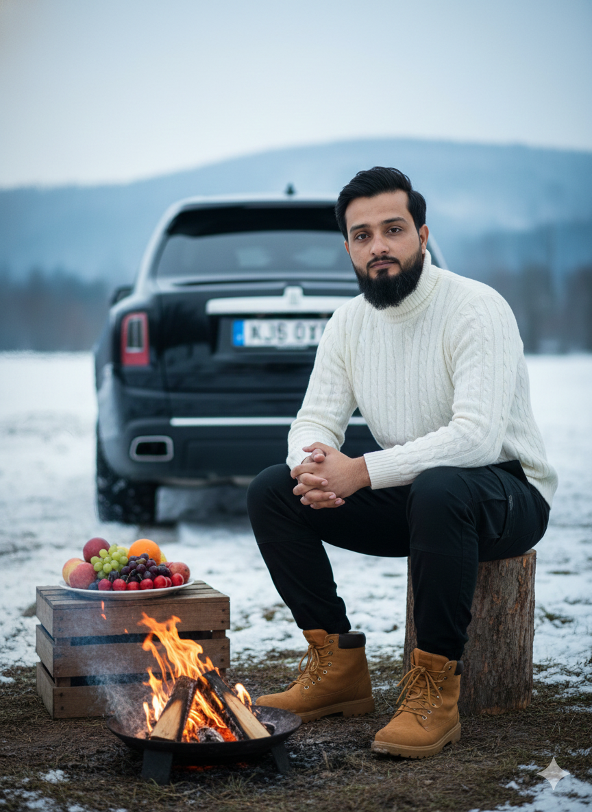 Winter Portrait with Campfire and Car